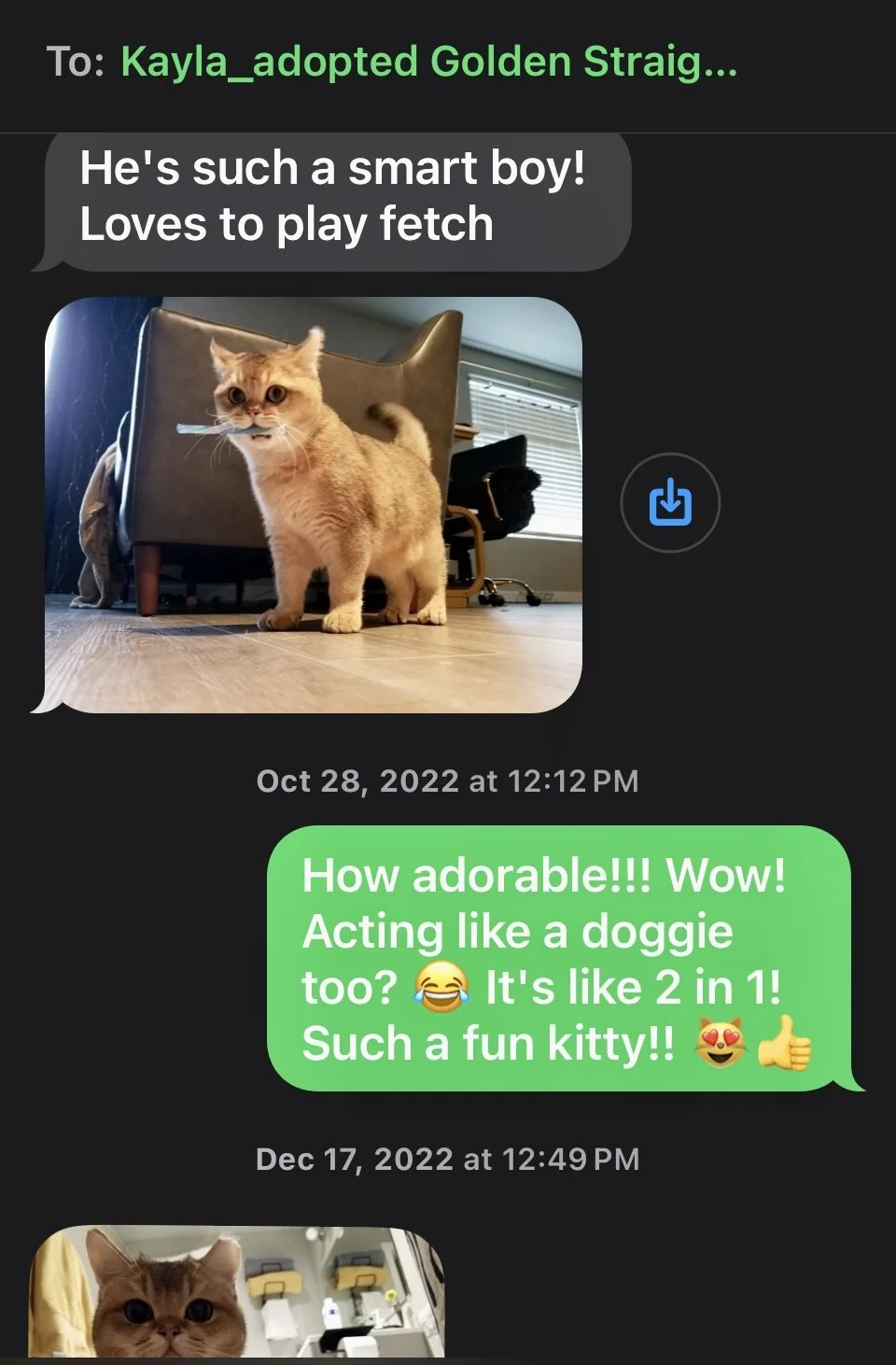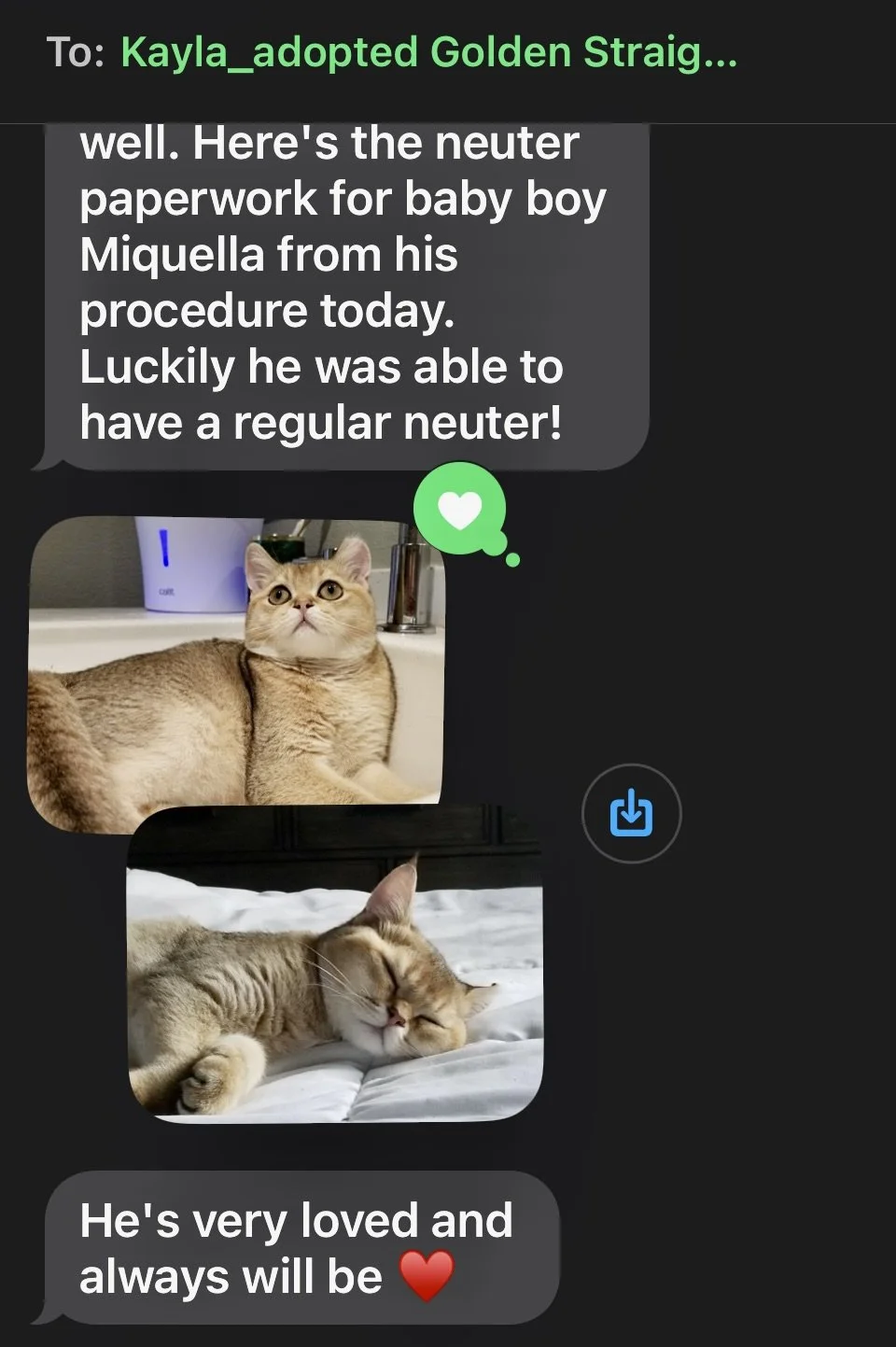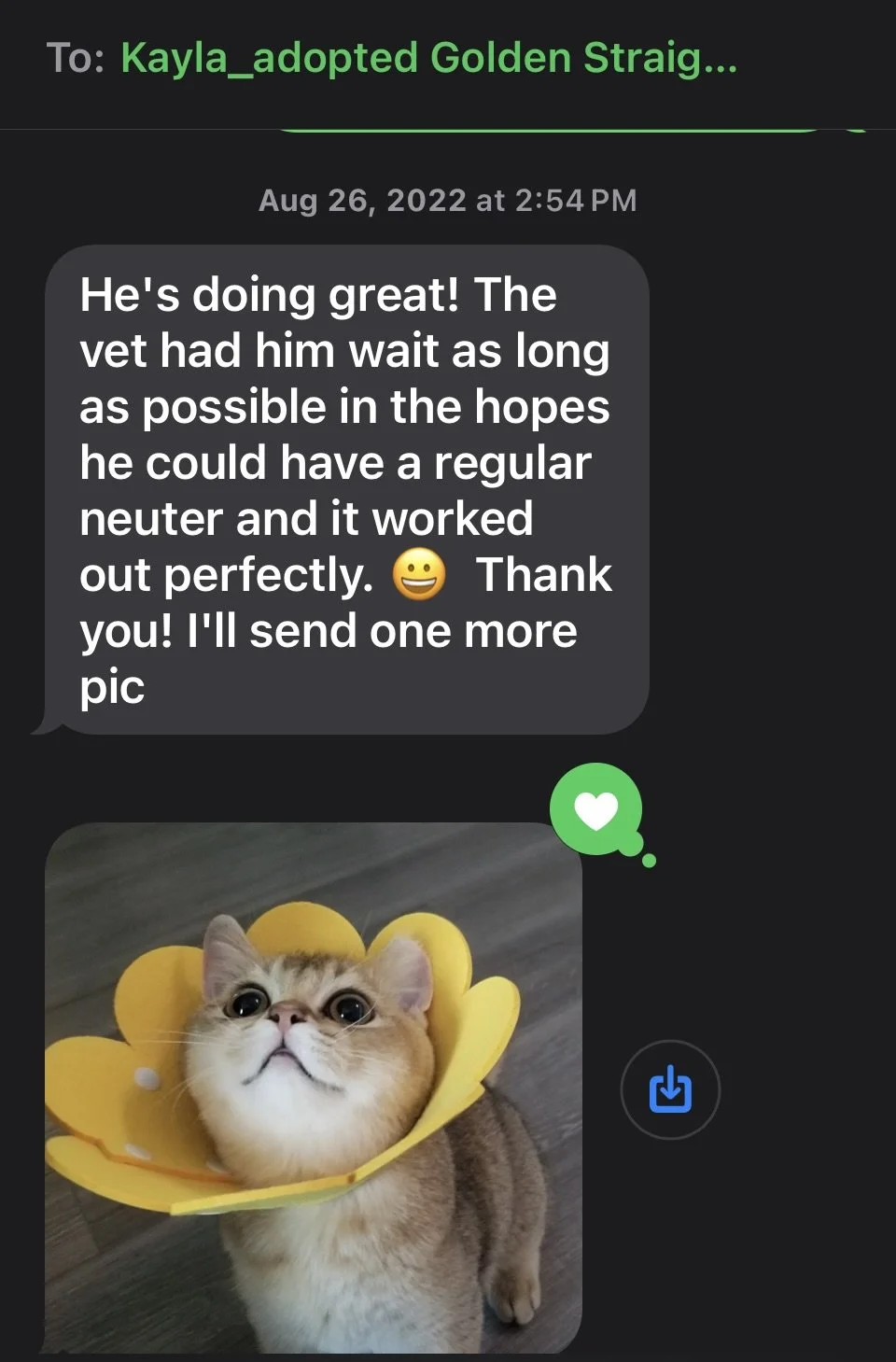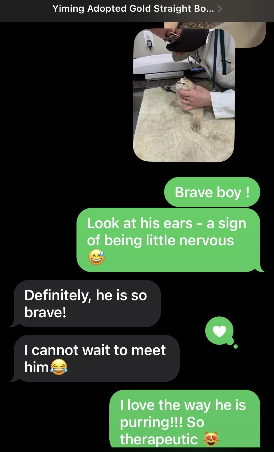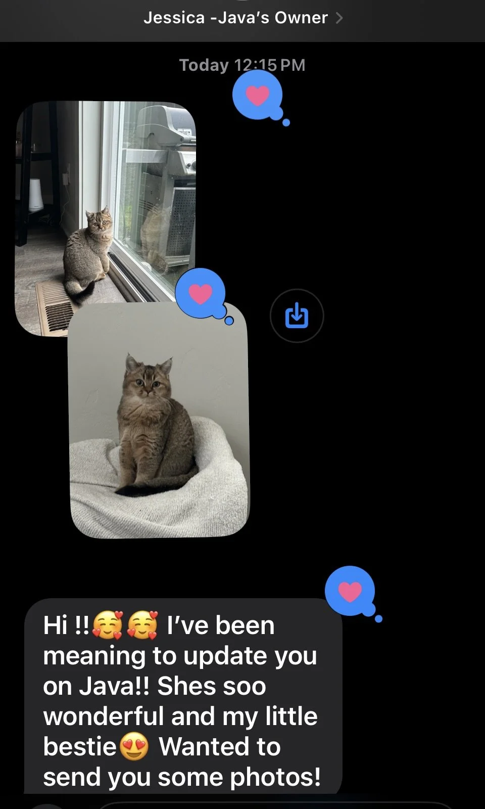 "Just wanted to let you know that she is doing well and I am so lucky to have her in my life! I named her Baguette, she is the sweetest thing ever and I love her more than anything else, I am so lucky to have her! I am forever grateful to you guys for bringing her into my life!”