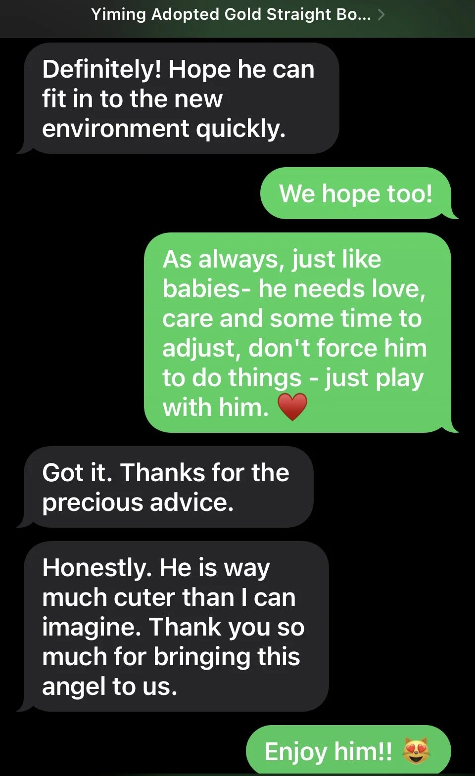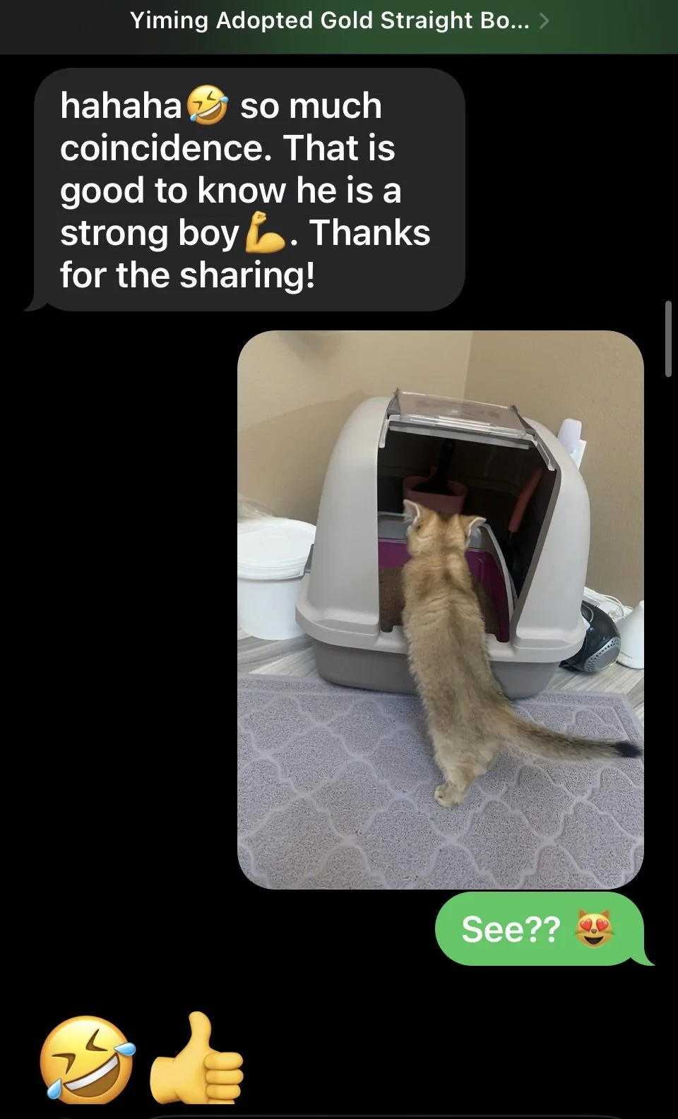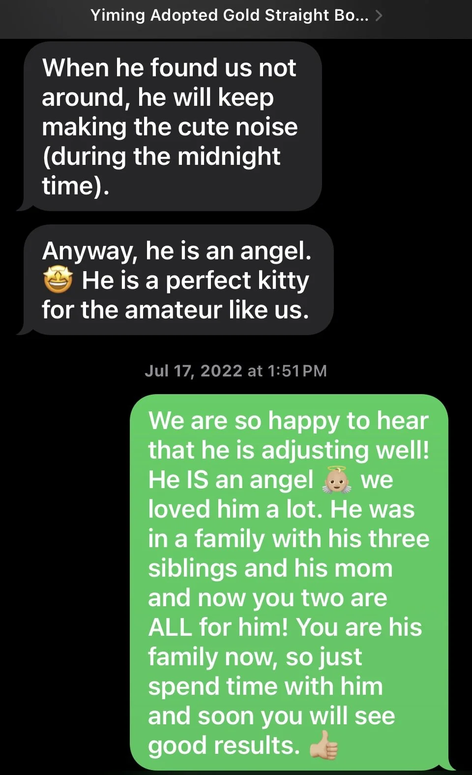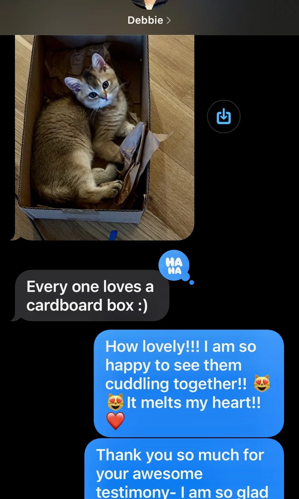 The next day: Maggie is already getting comfortable, exploring the house, playing with toys and jumping into my lap. So good about using the litter box too. And eating more. I’ve put up a gate so she can slowly get to know her big brothers until she’s comfortable. She’s such a sweet heart and I’m so happy to have her. I’m so attached to her already. She’s so full of joy!💓 Thank you for raising such a beauty!!