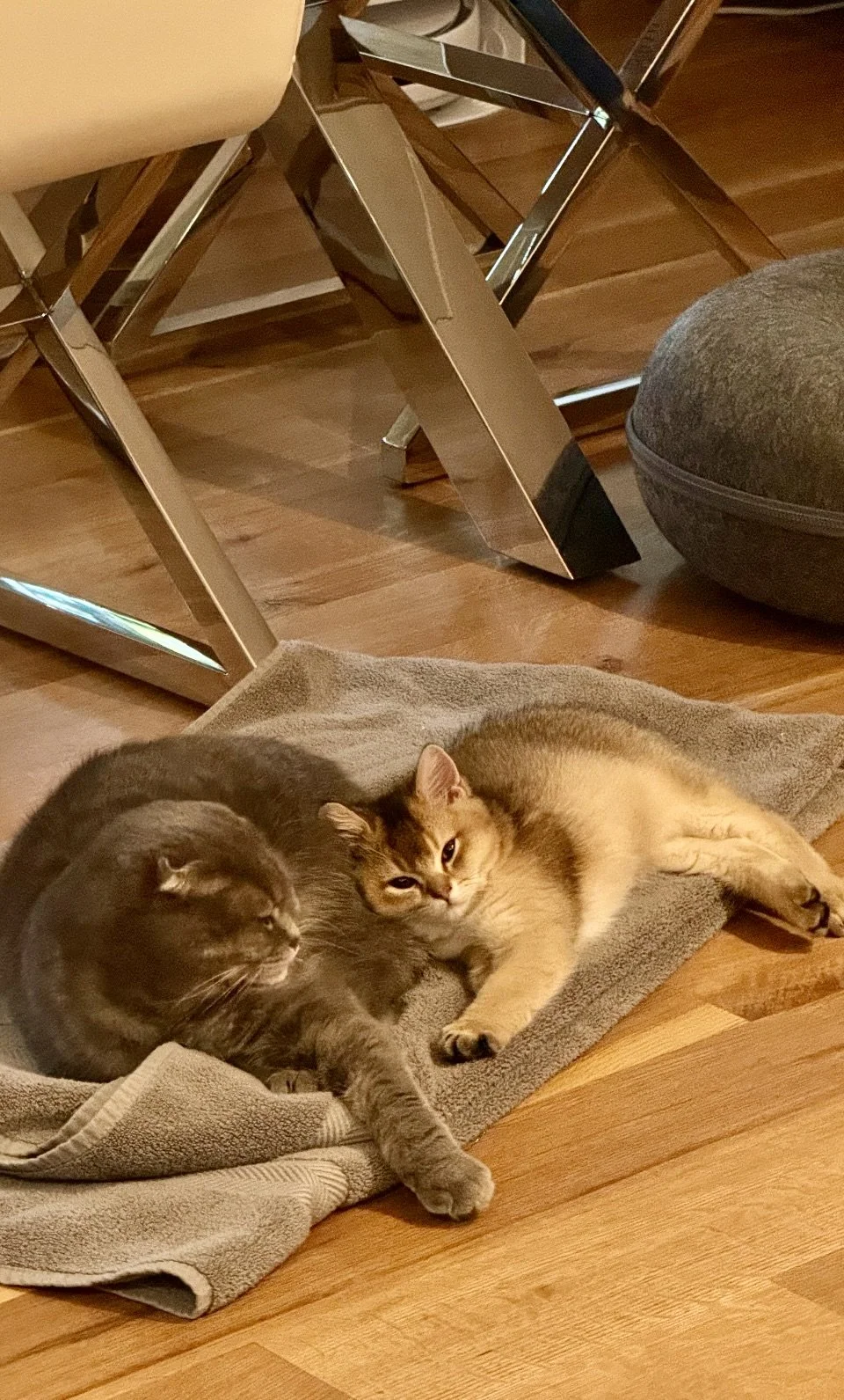 One day we got a call from NY! Mike got interested in one of our little silver tabby male kitten that looked identical to the one that he lost recently. A year later, from the next litter, he adopted a silver chinchilla female kitty from the same parents and was happy to fly down here to pick up a biological sister for his kitty! 😻 😻 So, after introducing them carefully to each other, he was sending us updates almost daily: “ They really insist on being together and are sharing everything.” “There’s a lot of chasing and playing too, it’s harder to catch on camera.” “Pearl has established herself quickly and after just a few days Huxley has been nothing but cool about it! I think they’re going to be great together!”