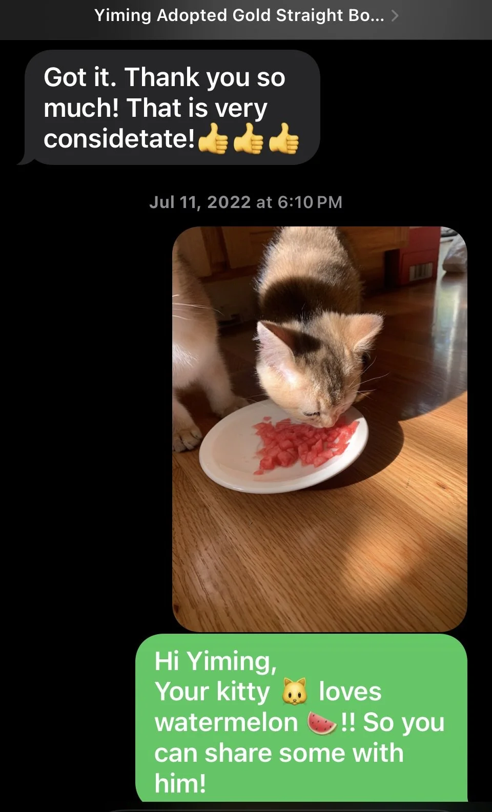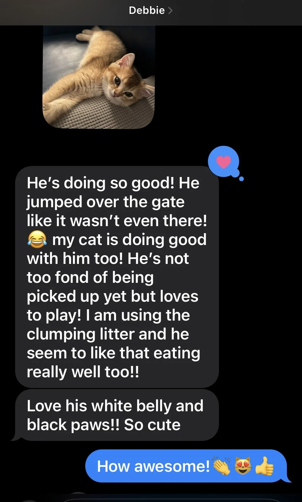 "Hi Katrina. Just want to let you know that Maggie is doing great. She was so quiet in the car coming home. Just watched out the window. I had a hard time getting her to eat her can food but I found if I put it on my finger she would lick it off. She ate quite a bit that way. She loves her new stick toy, similar to the one in your video. She has endless energy —so fun. I love her loud purr. Such a sweetie….😻
