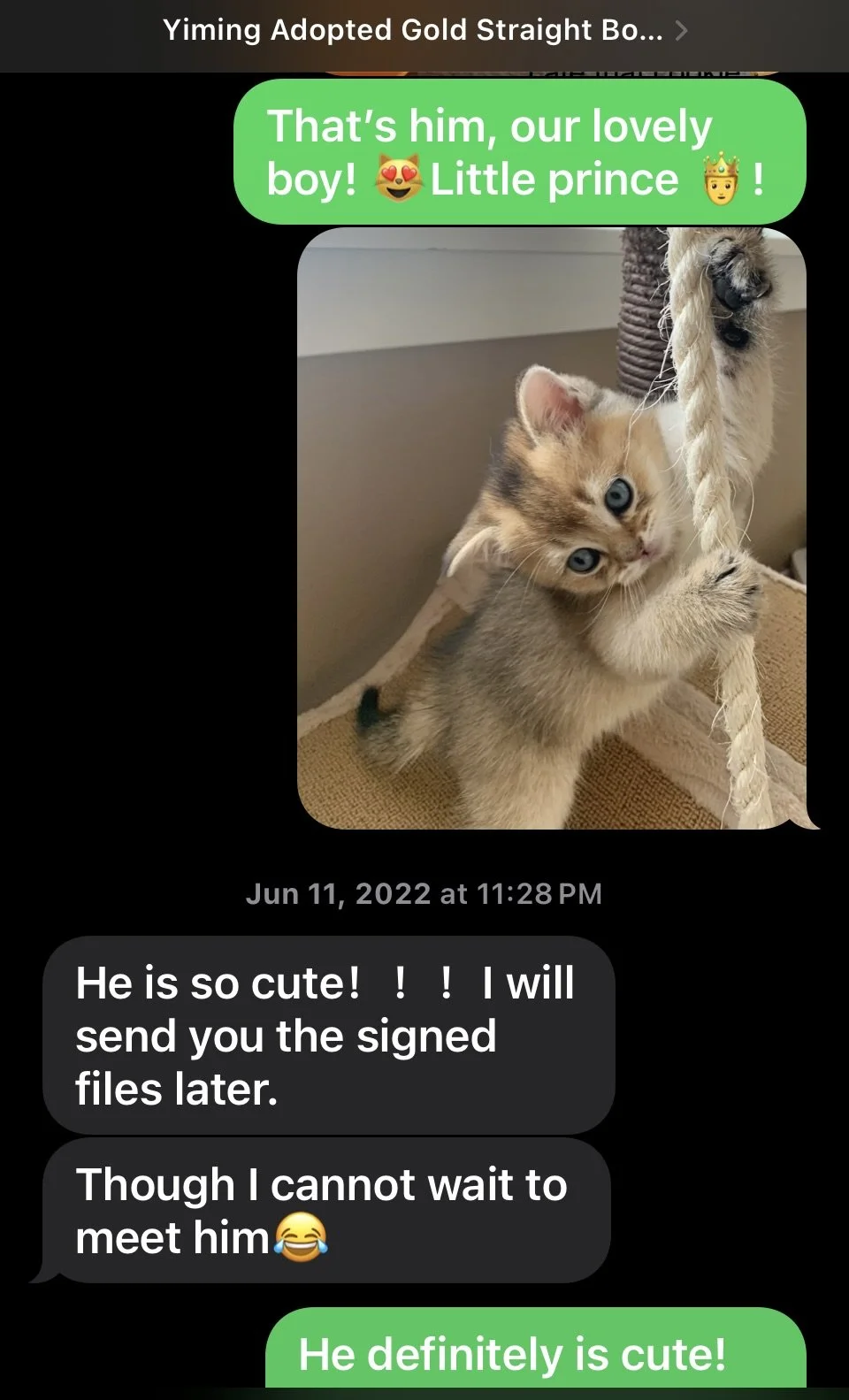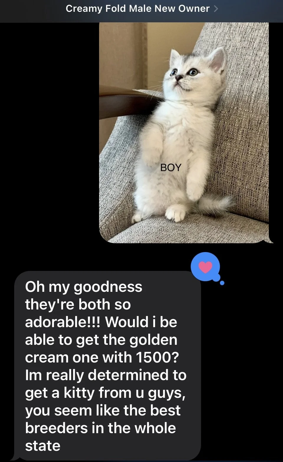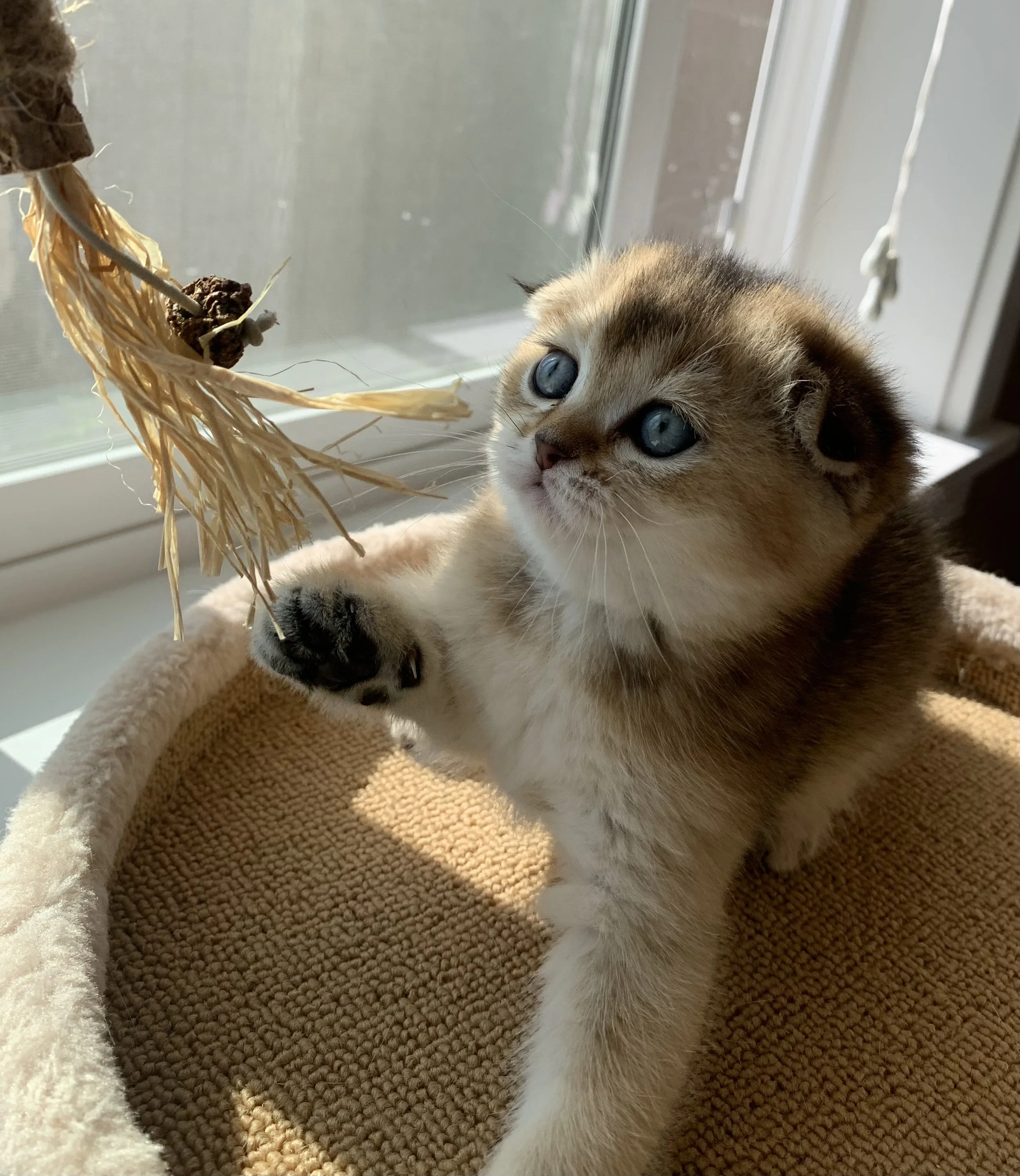 "The scottish straight beautiful male kitten I got from this breeder is the most adorable and loving little ball of fur I’ve ever owned. My kids enjoy playing with him! The breeder was very helpful in answering all of my questions and ensuring that I had all of the necessary information before adopting the kitty. I’m so happy with my new kitten and would recommend this breeder to anyone looking for a calm and affectionate, playful and energetic kitten."