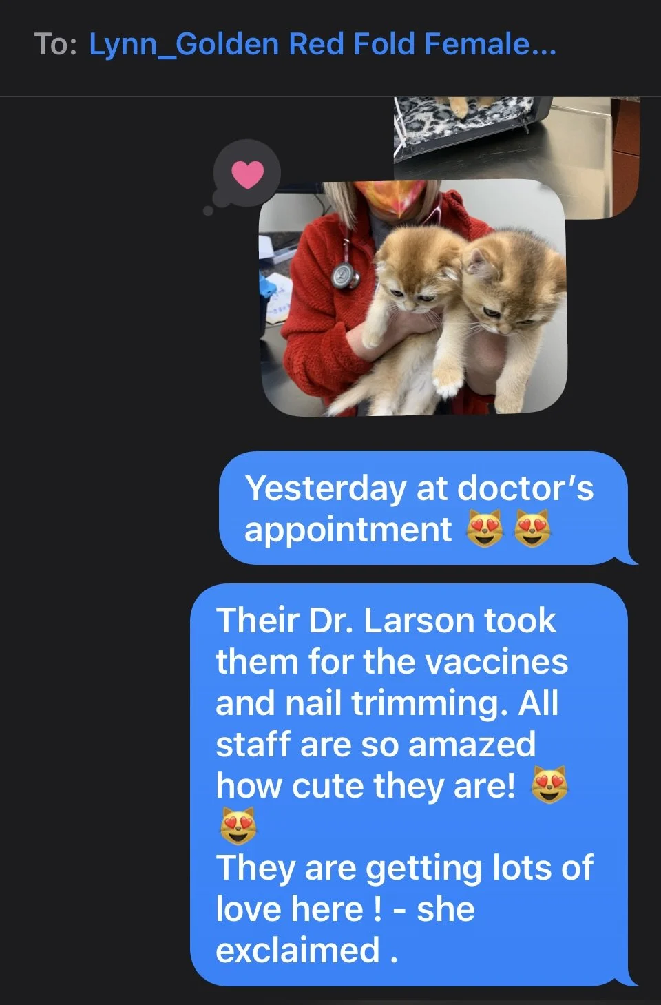 "Discovering Katrina was a stroke of luck for me and my feline-loving family. A year ago, we welcomed Dima, a silver Scottish Fold, into our home. His gentle nature and extraordinary affection have been a constant source of joy, truly epitomizing the characteristics of a well-cared-for treasure of a cat. Recently, we added Skye, his biological brother, to our family, and he mirrors Dima's delightful traits in every way. As a repeat customer, I can confidently say that Katrina's commitment to quality and care shines through in these wonderful cats. We couldn't be happier with our furry family members!."