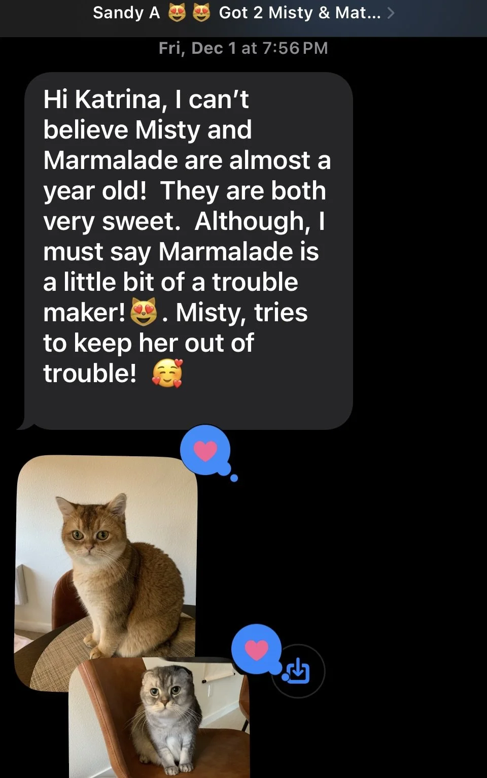 "Hi Katrina, I couldn’t believe how easy the ride home went. No kitten crying. They just moved in and took over the house. Our granddaughter has been so gentle with them that they are comfortable sitting with her. I get kitten loves every day and sometime they compete for lap time. I can’t thank you enough for allowing us to bring these 2 bundles of love & joy into our lives. ”