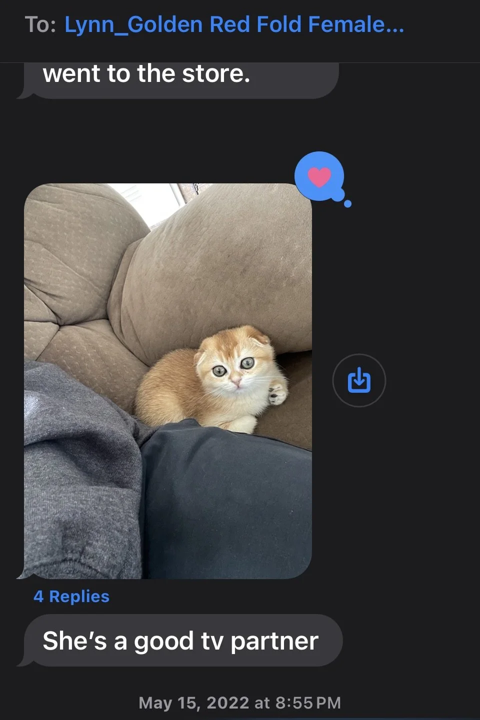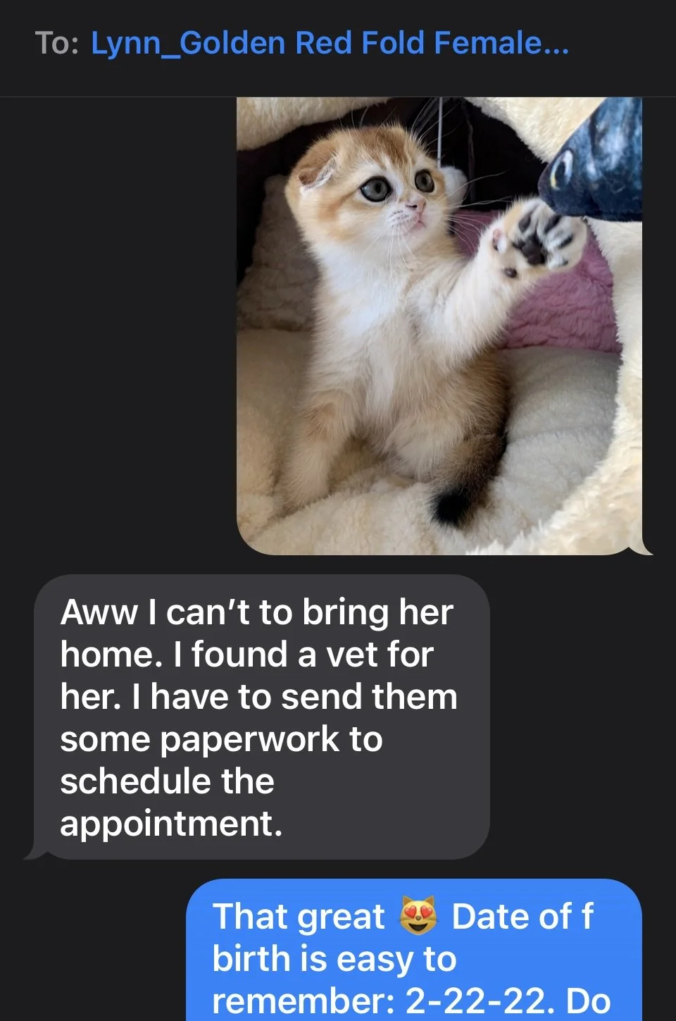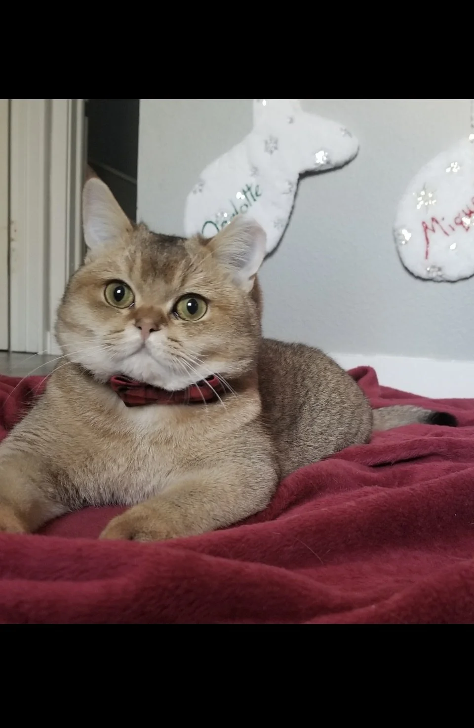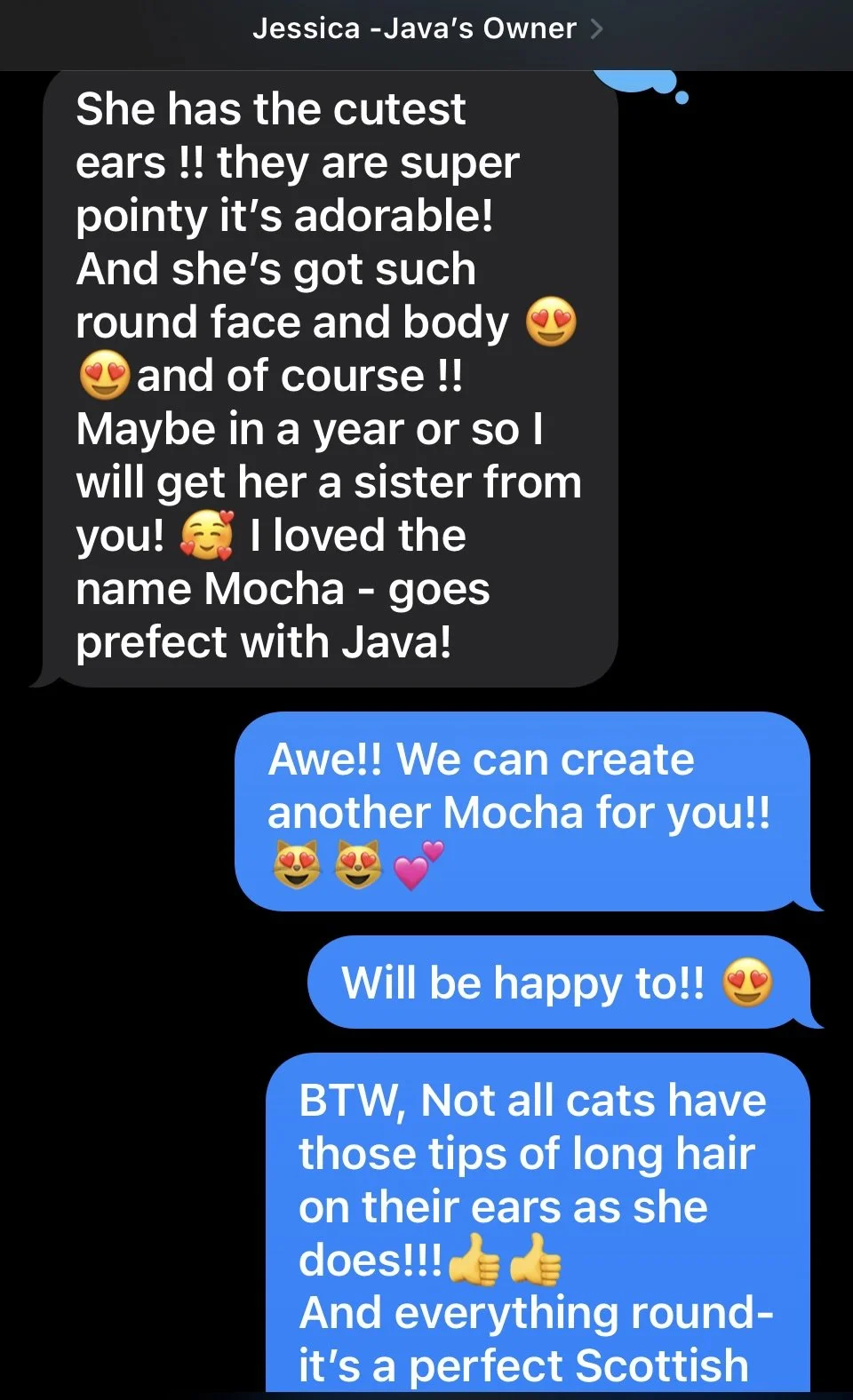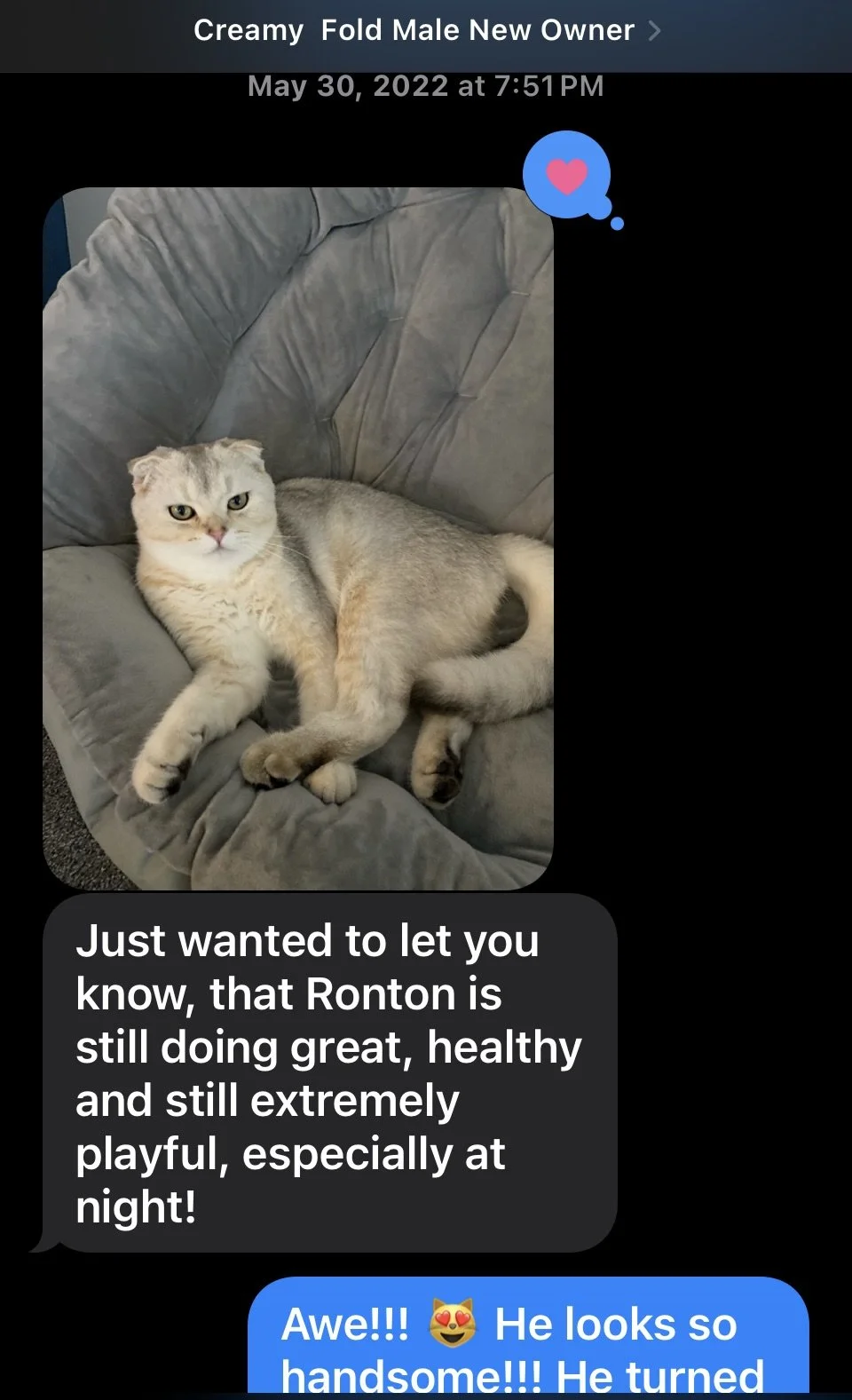 "We got Scotty after my daughter got a kitten from Katrina, we loved the home environment that the kitties were raised in and wanted to get one for ourselves. We got to pick out Scotty right away and Katrina kept us updated with wonderful photos and updates about his personality until we were able to take him home, he fit in right away and was very comfortable with my 5 year old Scottish fold, he’s very playful and has a loving personality and wants to please you so the training was a breeze, not one accident or sleep issues with him, we are so pleased and happy with Scotty and could not recommend Katrina and her family more for your new baby 😻"