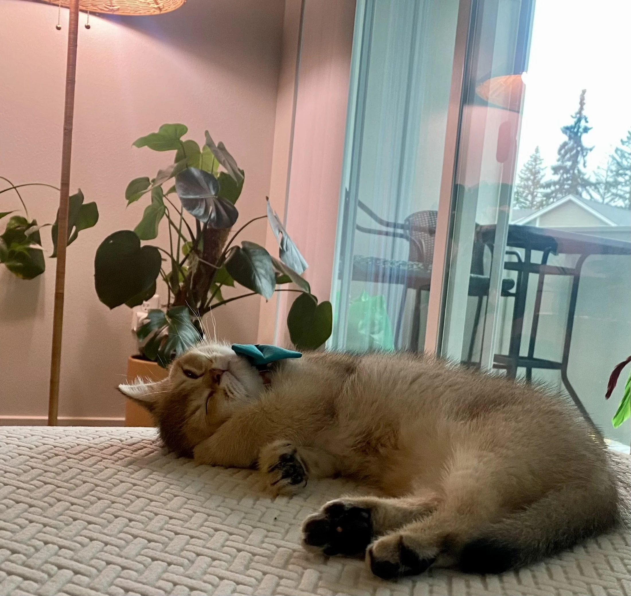 "Katrina - thank you so much for bringing Toulouse into our lives! He’s such a curious, playful, and snuggly kitten! I really appreciate your promptness in responding to my inquiry when asking about him, and the great care you gave. We really appreciate the photos/videos you provided while he was growing. We can tell you really love your cats 💜 He’s adjusting perfectly to his new home and loves his kitty castle, toy springs, and trying to knock over my plants 🤣!”