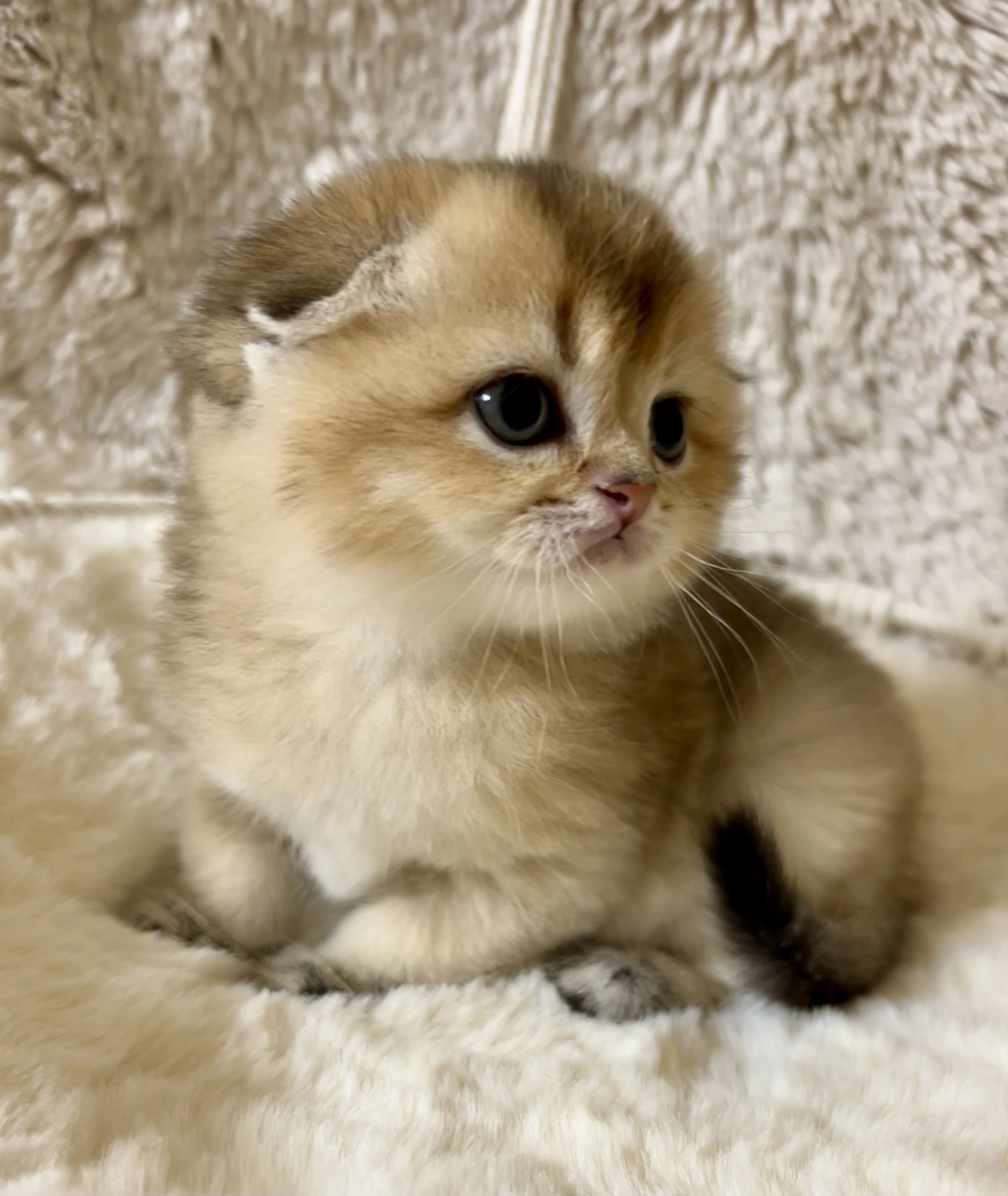 Shorthair Scottish Fold Dark Golden Female Kitten, sweet and playful! Black point, soft as dawn coat, chocolate paw beans.