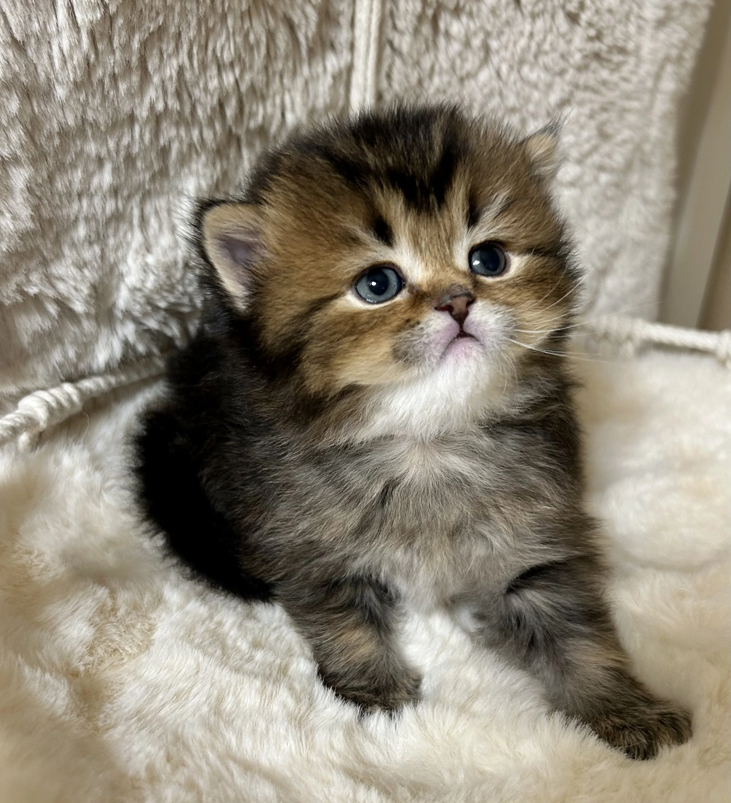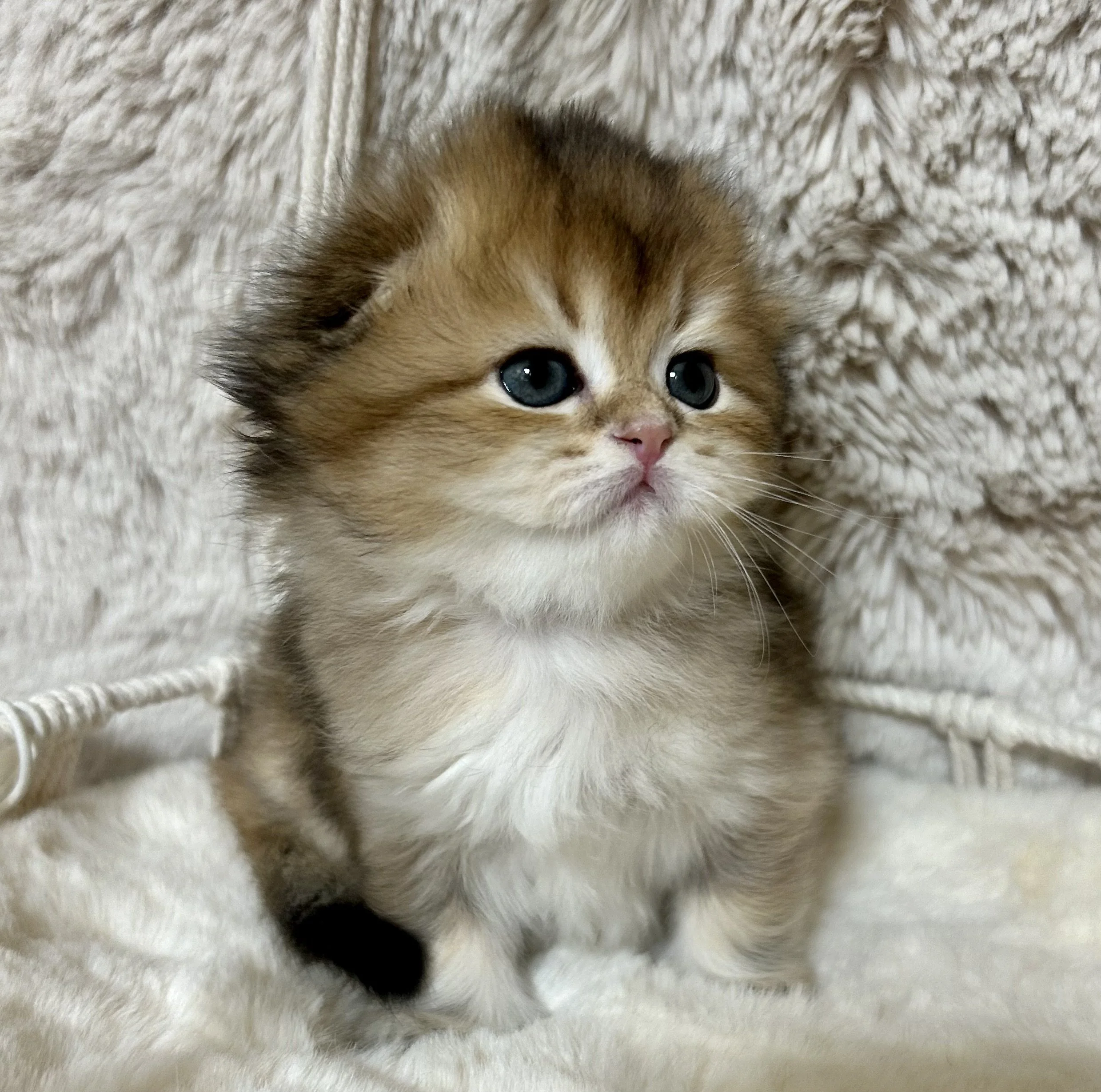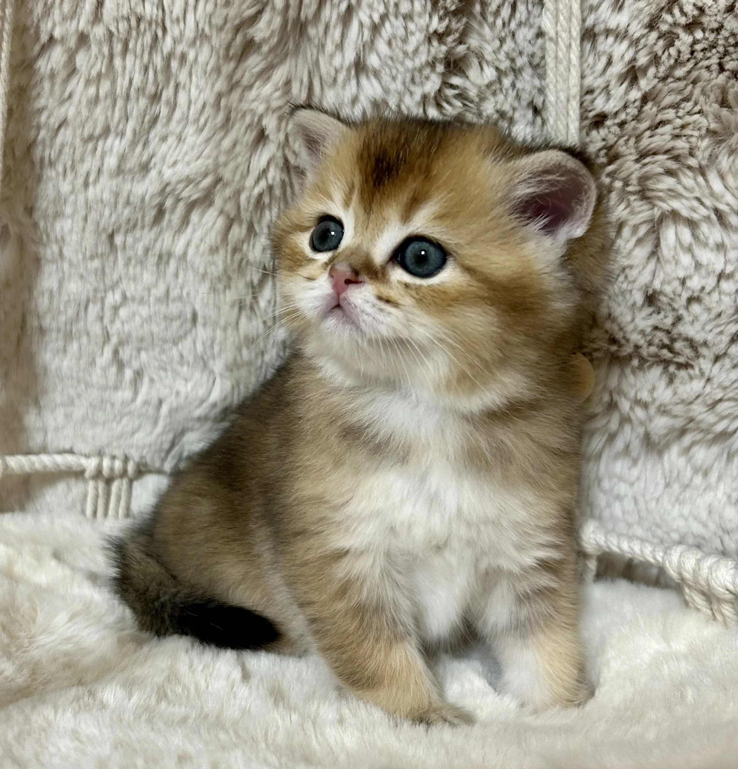 Shorthair Scottish Straight Golden Male Kitten, energetic and playful! Chocolate color paw beans, silky coat. Will be ready to move to his new sweet home November 15, 2025.