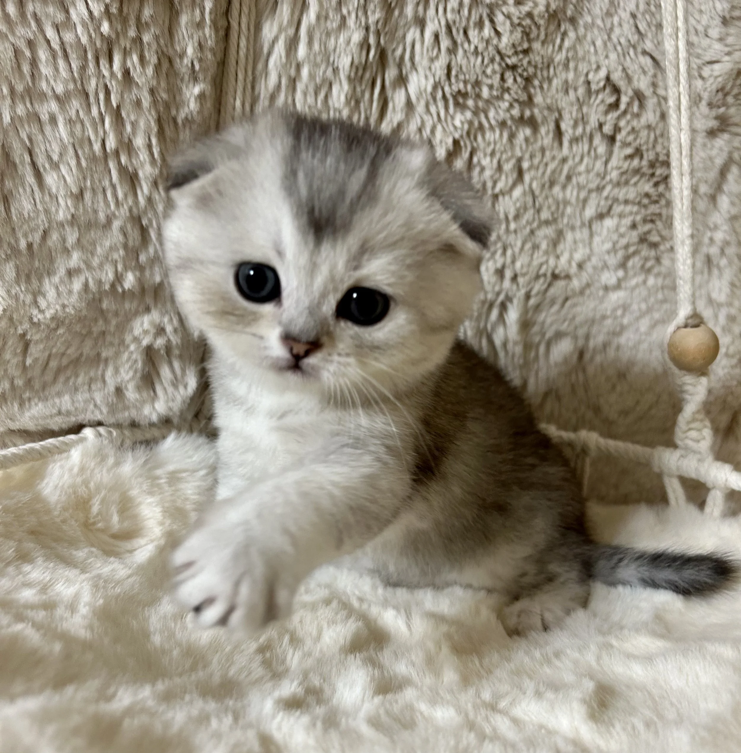 Shorthair Scottish Fold Silver Chinchilla Male kitten. Sweet and playful! Silver white fluffy coat, black paw beans.