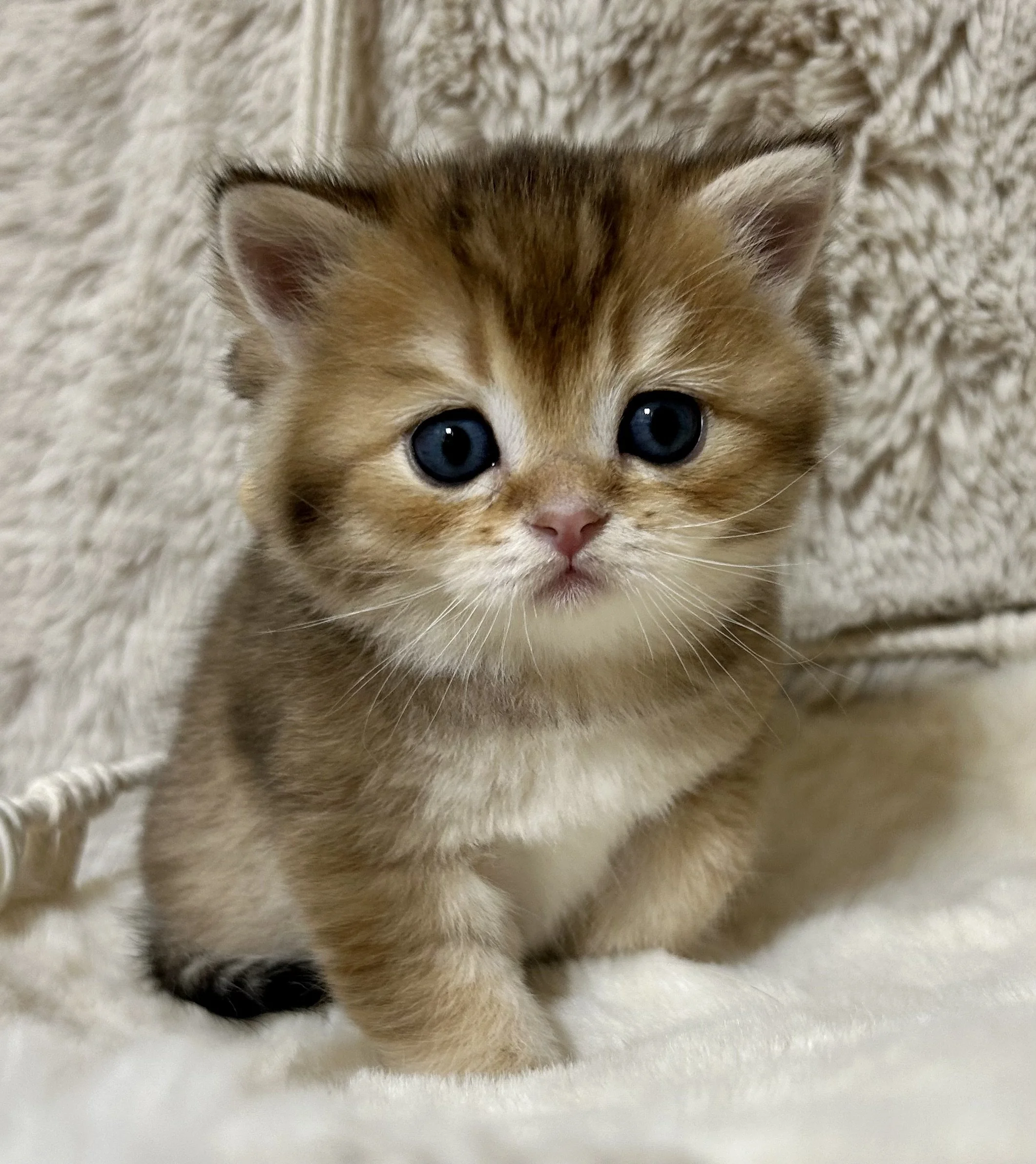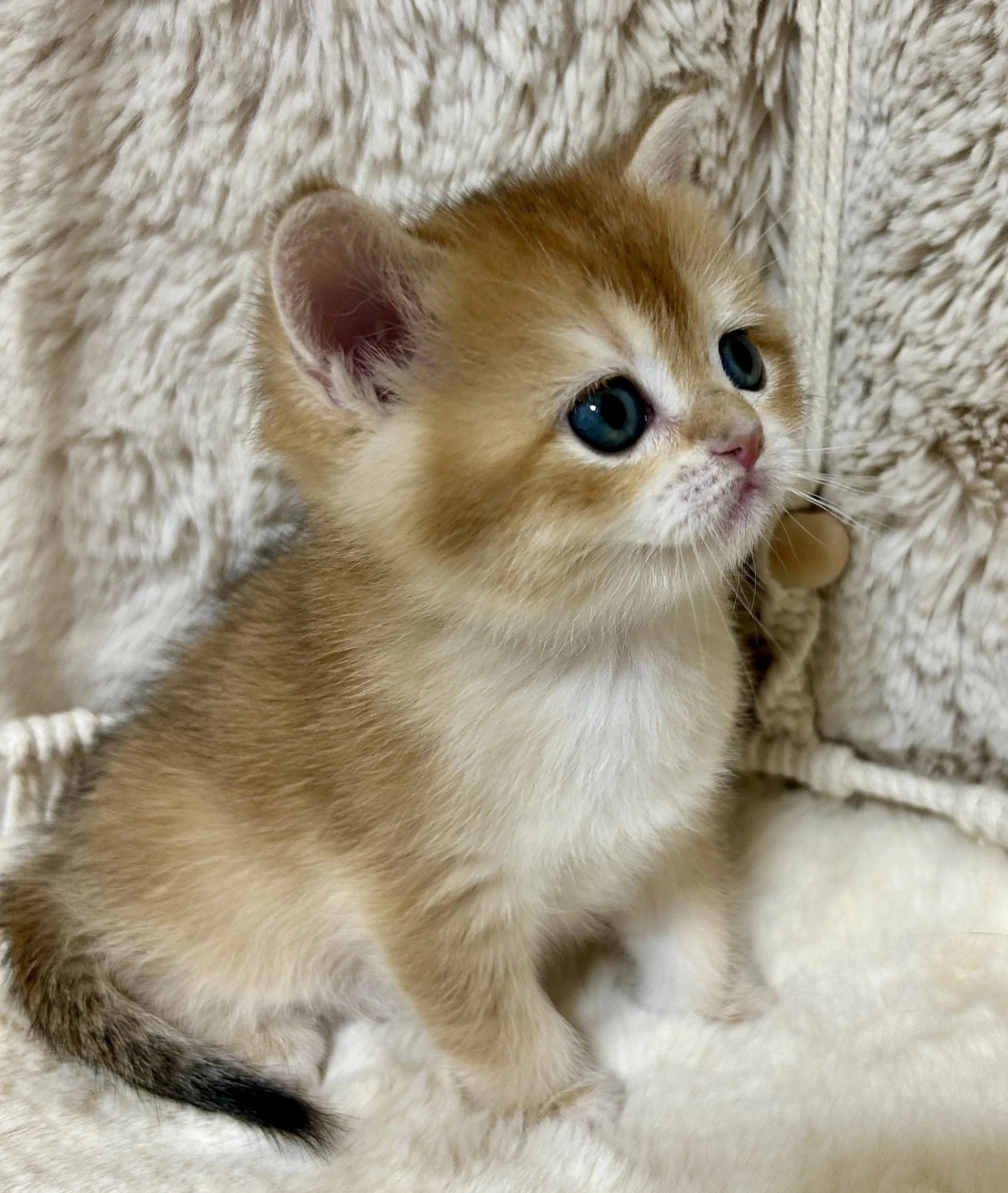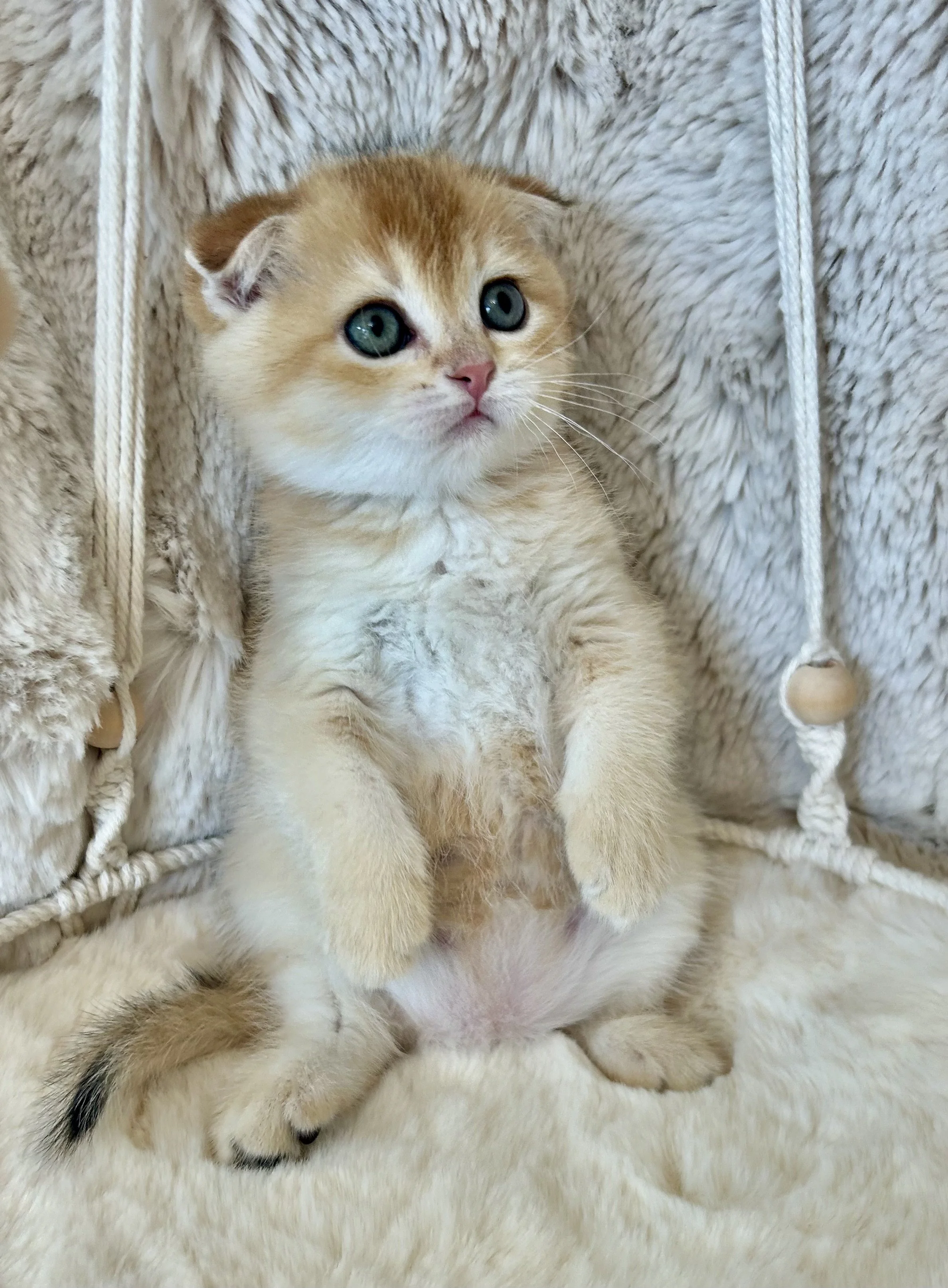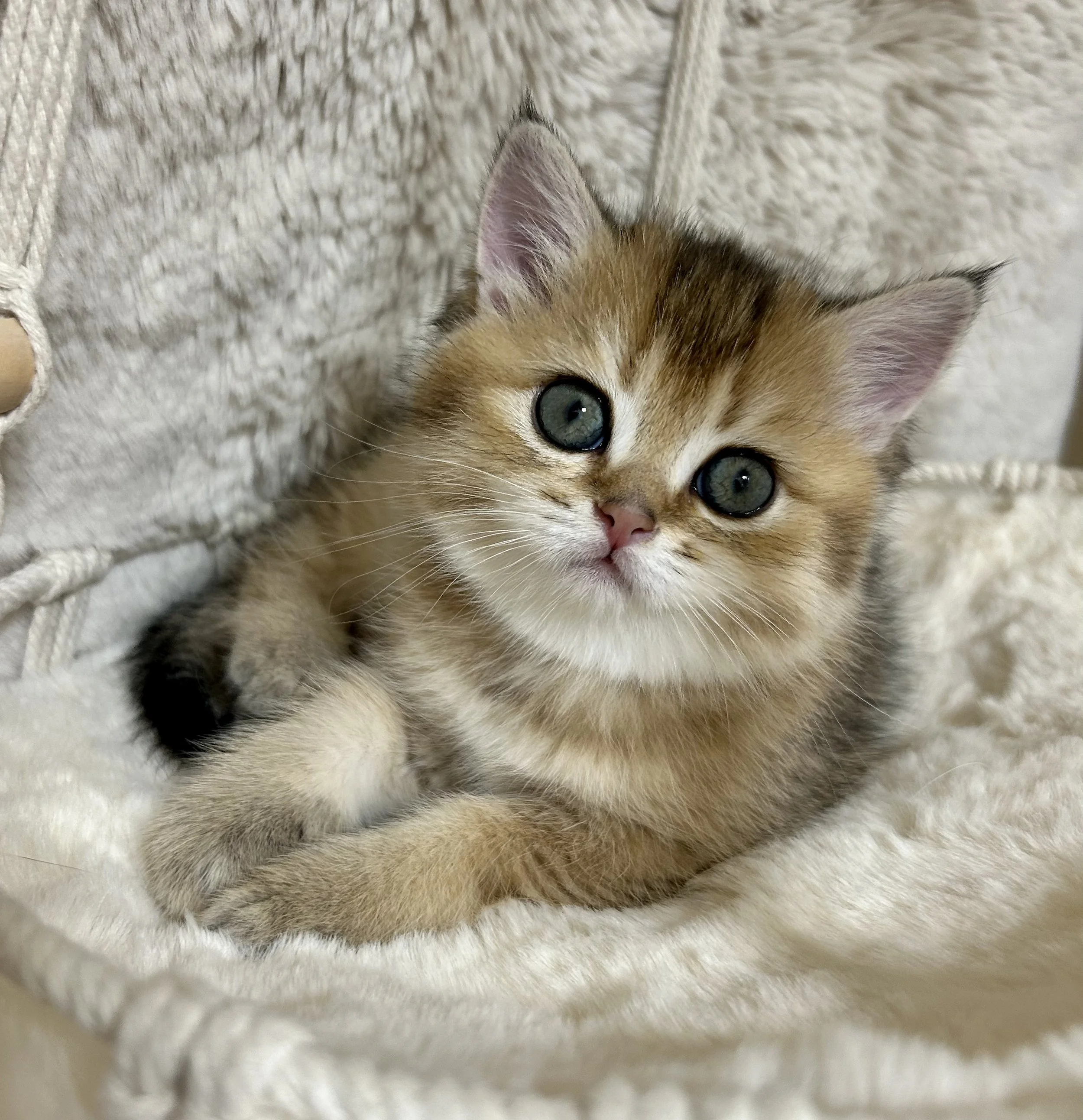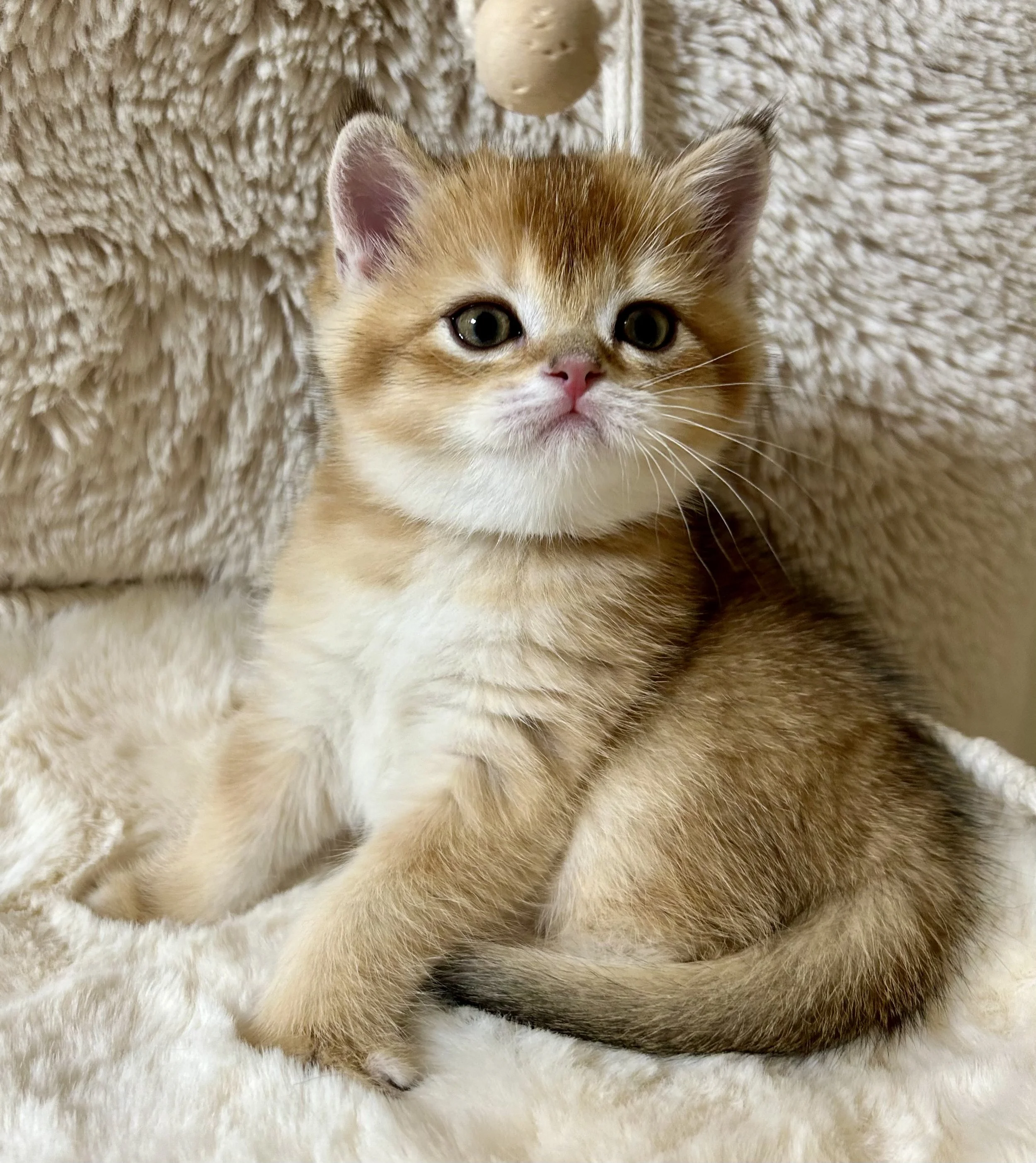 Shorthair Scottish Straight Golden Female Kitten, affectionate and playful! Softest fur! Look at her ear tips! Black paw beans, ringed tail. She can move to her new home November 1, 2025.