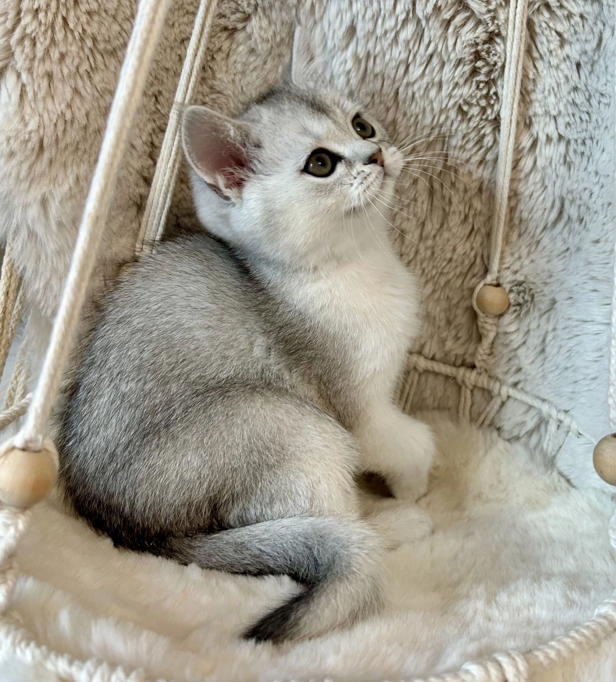 Shorthair Scottish Straight Silver Chinchilla Male, soft shimmer silver coat. Sweet, energetic and playful! Gentle when he plays.